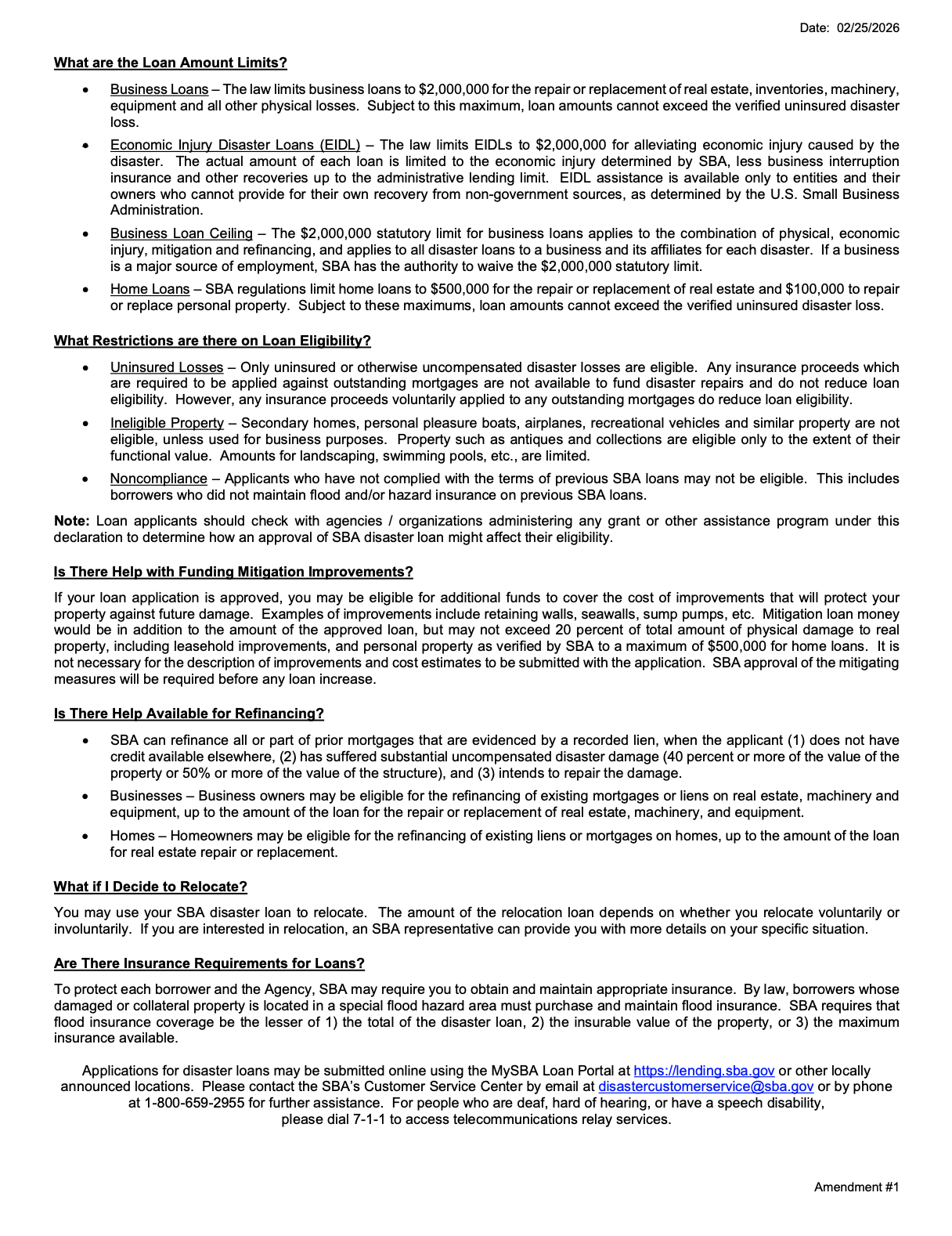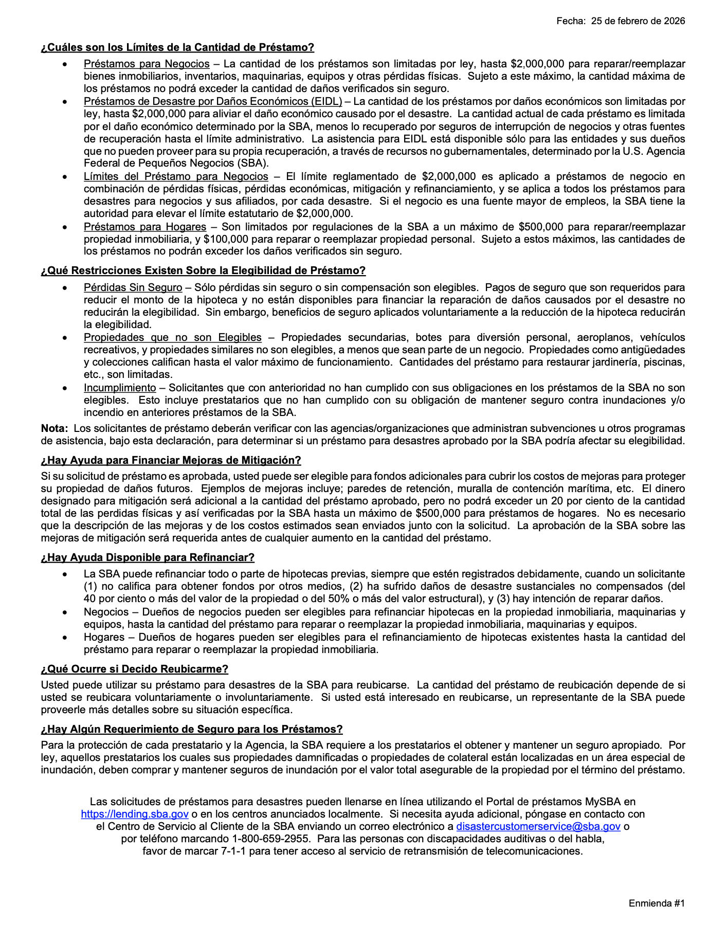 Para apoyar la recuperación tras las inundaciones, se ha abierto un nuevo canal de asistencia. La Administración de Pequeñas Empresas (SBA, por sus siglas en inglés) de EE. UU. ha anunciado préstamos por desastre a bajo interés, no solo para empresas, tras una declaración oficial de desastre.