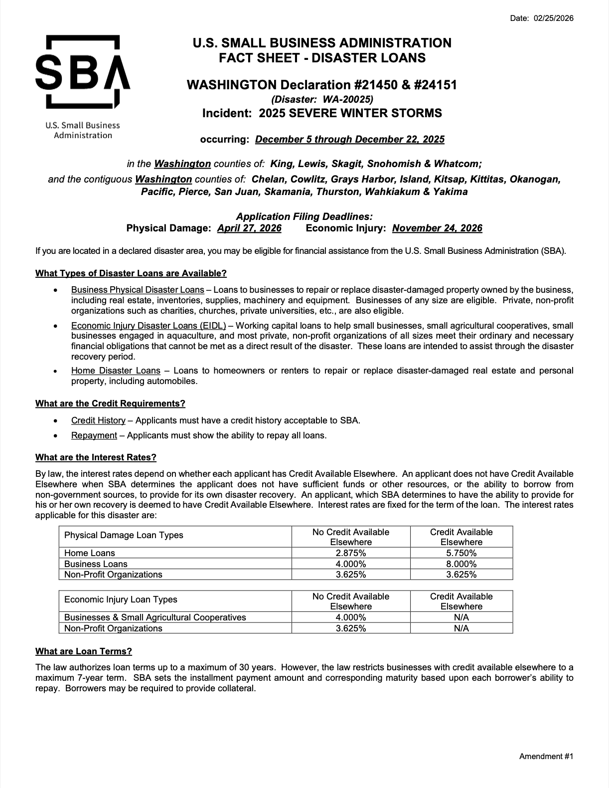 WASHINGTON — The U.S. Small Business Administration (SBA) announced the availability of low interest federal disaster loans to Washington businesses, private nonprofits and residents to offset physical and economic losses from the 2025 Severe Winter Storms occurring